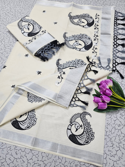 Kerala Saree with Embroidery in Silver Zari