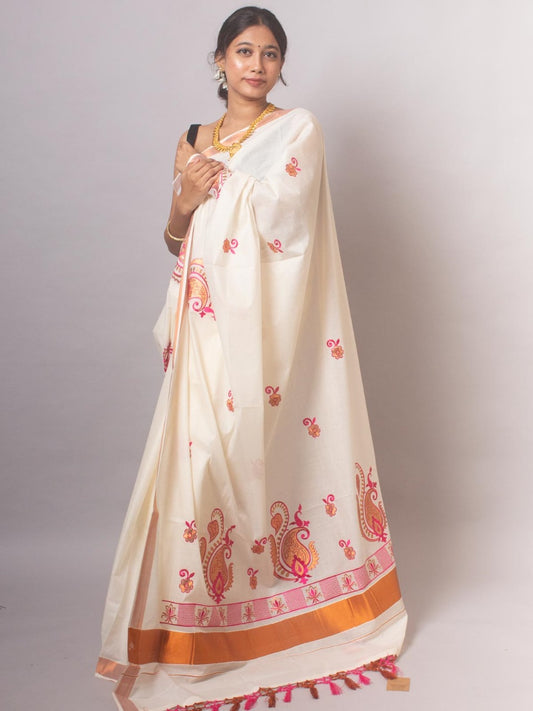 Kerala Saree with Embroidery in Copper zari