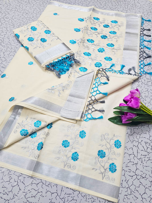 Kerala Saree with Embroidery in Silver Zari