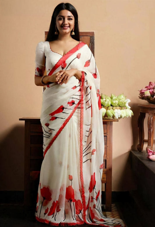 • Christmas Special White Floral Linen Sarees
