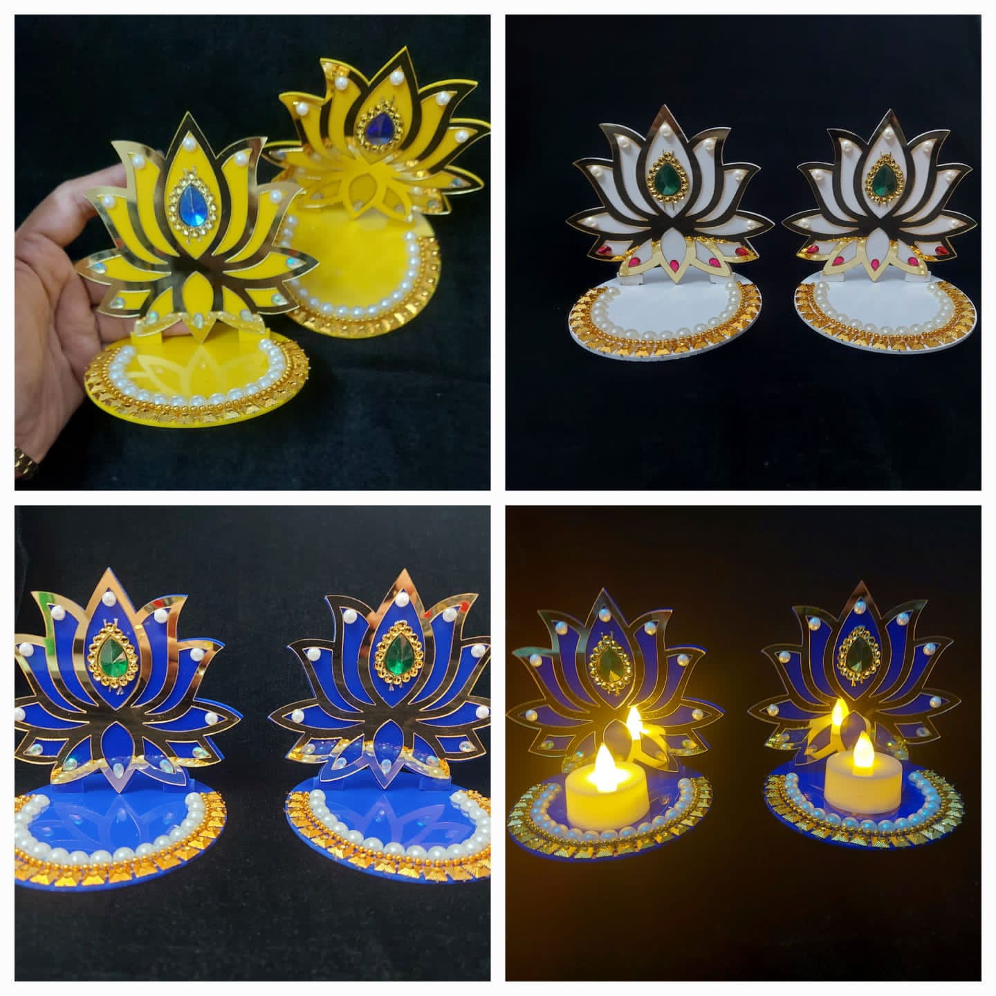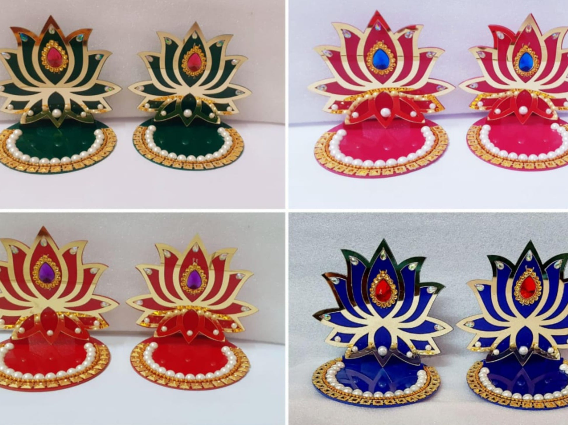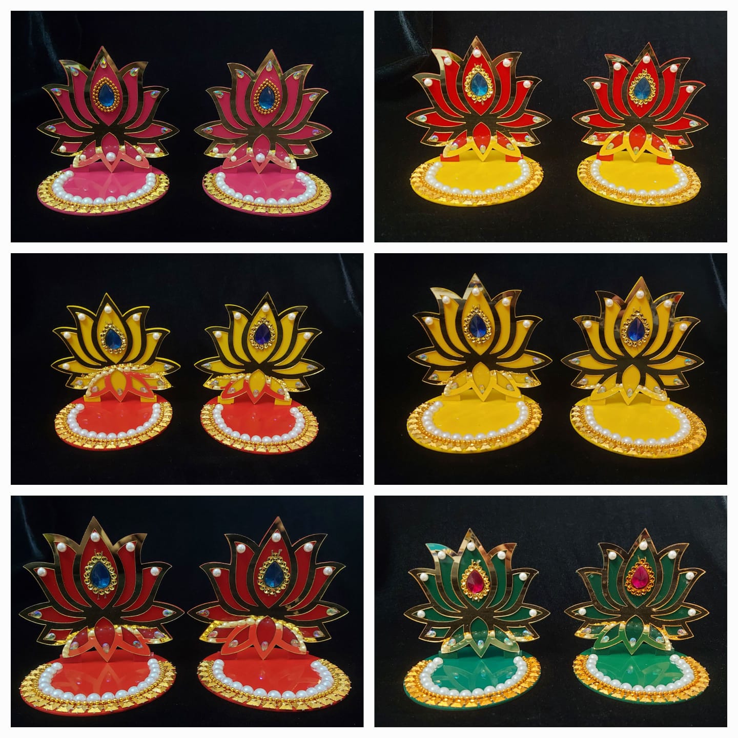 Acrylic hand decorated lotus diya stands with beads and pearls.
