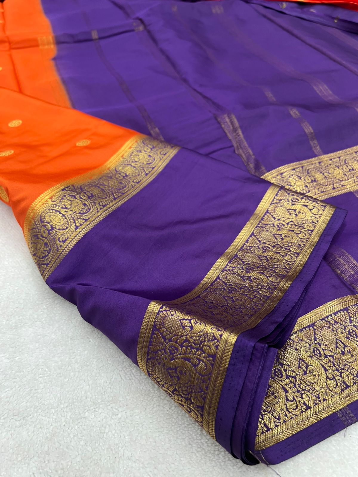 Exclusive Mysore semi crape silk with chit pallu and contrast gap borders with mango designs.