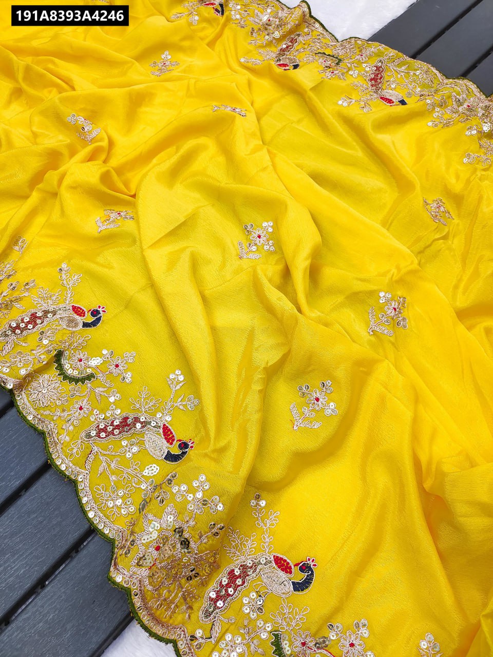 Premium Chinon Silk Sarees with Heavy Embroidery Threads Coding & Sequence Work